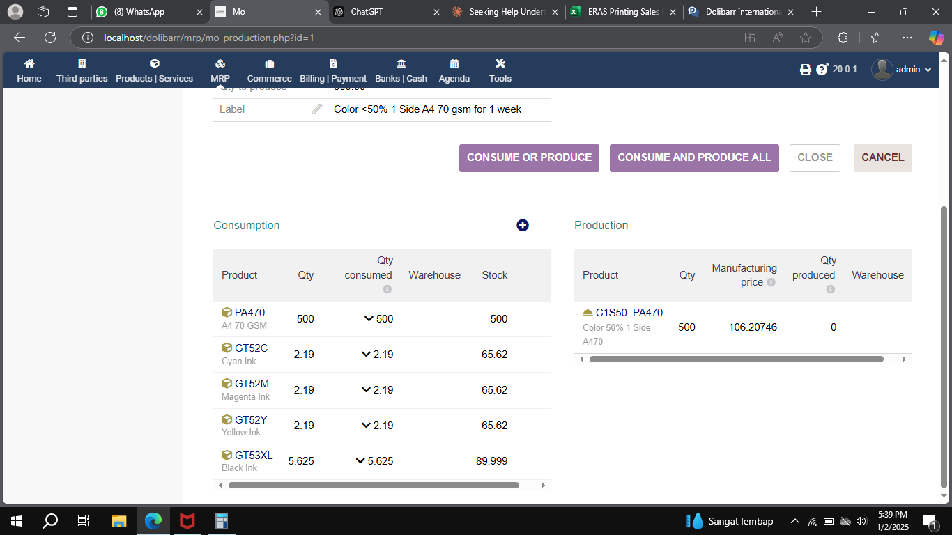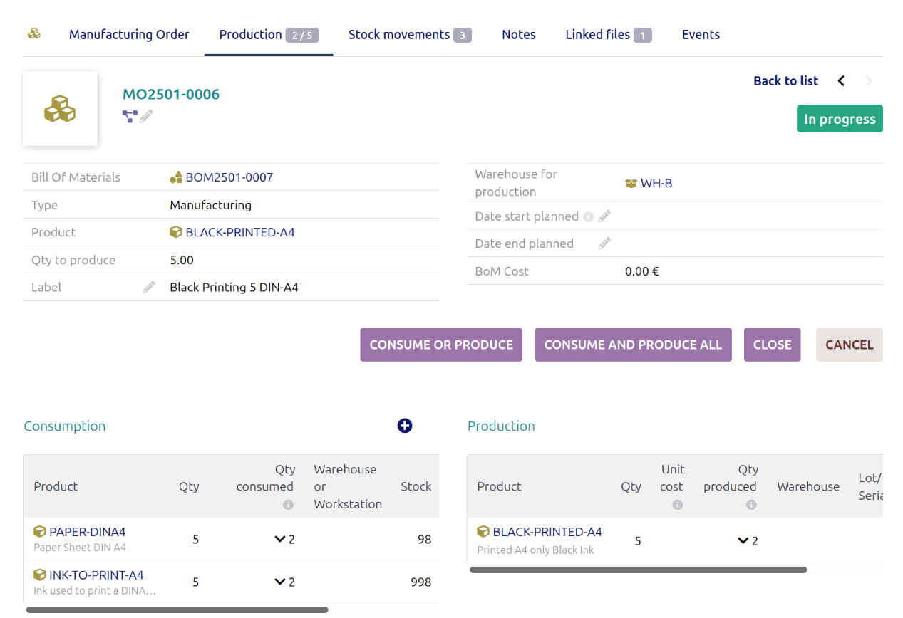I’ve created a BOM for my printing service, but I’m having trouble with the Manufacturing Order (MO). When I set up the consumption of materials (ink and paper) according to the service quantity I need, the consumption part works fine like in this picture.