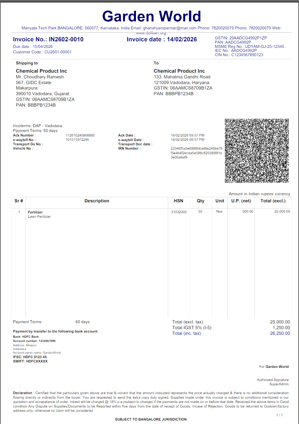 "SignedInvoice": "eyJhbGciOiJSUzI1NiIsImtpZCI6IjNCRTE3RTUxNDE5MjUyMjY0N0YwMUZEQkZGNTI3MUFENTI2OEQ3MzUiLCJ4NXQiOiJPLUYtVVVHU1VpWkg4Ql9iXzFKeHJWSm8xelUiLCJ0eXAiOiJKV1QifQ.eyJpc3MiOiJOSUMgU2FuZGJveCIsImRhdGEiOiJ7XCJBY2tOb1wiOjExMjYxMDI0MDg2ODg4NSxcIkFja0R0XCI6XCIyMDI2LTAyLTE2IDE2OjI3OjAwXCIsXCJJcm5cIjpcIjIzMzQ2ZjVhM2U2OTg4YjZhNDhlMjQ2NmU3NmY1ZTRiNGYyZWNkYTVlNTg4YzgyNTU4OWY4MWIzZTA2YTlhZjlcIixcIlZlcnNpb25cIjpcIjEuMVwiLFwiVHJhbkR0bHNcIjp7XCJUYXhTY2hcIjpcIkdTVFwiLFwiU3VwVHlwXCI6XCJCMkJcIixcIlJlZ1JldlwiOlwiTlwiLFwiSWdzdE9uSW50cmFcIjpcIk5cIn0sXCJEb2NEdGxzXCI6e1wiVHlwXCI6XCJJTlZcIixcIk5vXCI6XCJJTjI2MDItMDAxMFwiLFwiRHRcIjpcIjE0LzAyLzIwMjZcIn0sXCJTZWxsZXJEdGxzXCI6e1wiR3N0aW5cIjpcIjI5QUFEQ0c0OTkyUDFaUFwiLFwiTGdsTm1cIjpcIkdhcmRlbiBXb3JsZFwiLFwiVHJkTm1cIjpcIkdhcmRlbiBXb3JsZFwiLFwiQWRkcjFcIjpcIk1hbnlhdGEgVGVjaCBQYXJrXCIsXCJMb2NcIjpcIkJBTkdBTE9SRVwiLFwiUGluXCI6NTYwMDc3LFwiU3RjZFwiOlwiMjlcIixcIlBoXCI6XCI3ODIwMDIwMDc5XCIsXCJFbVwiOlwiZ2hhbnNoeWFtcGFybWFyQG1haWwuY29tXCJ9LFwiQnV5ZXJEdGxzXCI6e1wiR3N0aW5cIjpcIjA2QUFNQ1M4NzA5QjFaQVwiLFwiTGdsTm1cIjpcIkNoZW1pY2FsIFByb2R1Y3QgSW5jXCIsXCJUcmRObVwiOlwiQ2hlbWljYWwgUHJvZHVjdCBJbmNcIixcIlBvc1wiOlwiMDZcIixcIkFkZHIxXCI6XCIxMzMsIE1haGF0bWEgR2FuZGhpIFJvYWRcIixcIkxvY1wiOlwiVmFkb2RhcmFcIixcIlBpblwiOjEyMTAwOSxcIlN0Y2RcIjpcIjA2XCJ9LFwiRGlzcER0bHNcIjp7XCJObVwiOlwiR2FyZGVuIFdvcmxkXCIsXCJBZGRyMVwiOlwiTWFueWF0YSBUZWNoIFBhcmtcIixcIkxvY1wiOlwiQkFOR0FMT1JFXCIsXCJQaW5cIjo1NjAwNzcsXCJTdGNkXCI6XCIyOVwifSxcIkl0ZW1MaXN0XCI6W3tcIkl0ZW1Ob1wiOjAsXCJTbE5vXCI6XCIxXCIsXCJJc1NlcnZjXCI6XCJOXCIsXCJQcmREZXNjXCI6XCJGZXJ0aWxpemVyXCIsXCJIc25DZFwiOlwiMzEwMzIwMDBcIixcIkJhcmNkZVwiOlwiRmVydGlsaXplclwiLFwiUXR5XCI6NTAsXCJGcmVlUXR5XCI6MCxcIlVuaXRcIjpcIk5PU1wiLFwiVW5pdFByaWNlXCI6NTAwLFwiVG90QW10XCI6MjUwMDAsXCJBc3NBbXRcIjoyNTAwMCxcIkdzdFJ0XCI6NSxcIklnc3RBbXRcIjoxMjUwLFwiQ2dzdEFtdFwiOjAsXCJTZ3N0QW10XCI6MCxcIkNlc1J0XCI6MCxcIkNlc0FtdFwiOjAsXCJDZXNOb25BZHZsQW10XCI6MCxcIlN0YXRlQ2VzUnRcIjowLFwiU3RhdGVDZXNBbXRcIjowLFwiU3RhdGVDZXNOb25BZHZsQW10XCI6MCxcIk90aENocmdcIjowLFwiVG90SXRlbVZhbFwiOjI2MjUwfV0sXCJWYWxEdGxzXCI6e1wiQXNzVmFsXCI6MjUwMDAsXCJDZ3N0VmFsXCI6MCxcIlNnc3RWYWxcIjowLFwiSWdzdFZhbFwiOjEyNTAsXCJDZXNWYWxcIjowLFwiU3RDZXNWYWxcIjowLFwiRGlzY291bnRcIjowLFwiT3RoQ2hyZ1wiOjAsXCJSbmRPZmZBbXRcIjowLFwiVG90SW52VmFsXCI6MjYyNTB9LFwiRXdiRHRsc1wiOntcIlRyYW5zSWRcIjpcIjI0QU1UUFA2OTMxRzJaTFwiLFwiVHJhbnNOYW1lXCI6XCJTSFJFRSBIQVJTSURESEkgVFJBTlNQT1JUXCIsXCJEaXN0YW5jZVwiOjB9fSJ9.JUPOlr1dgZo7EAu5EhmzvGWtgqWRUTP3_Jsh53YEbJ3kcOBGFVYhbZfA5mgpcWnFT18Hi1fiA-Dmh4vrZGr5Unom2ALsj4_GFQbCZwJm6LrcYKyZaagEcJjrYdlq4bqsRJb2KklZu-yQVSOVVfv4KIYCJkRCfa6ovkAa9OE6hG6Dbc4vt0tkYwaUAWdZ4ZKRpaDktfMVlguxNn1uM998wuc90BSeuaVtl9_GxC_VHgyd-18IEMZR62RnBucjJ8jdn9AykxyxsmsV1wQXIWN4oigsGo7XXv5a6tV0T5QnGDMMCp29YiQ2XEA924UhdVCodorjiFZu7na7mQ_govX_mQ",