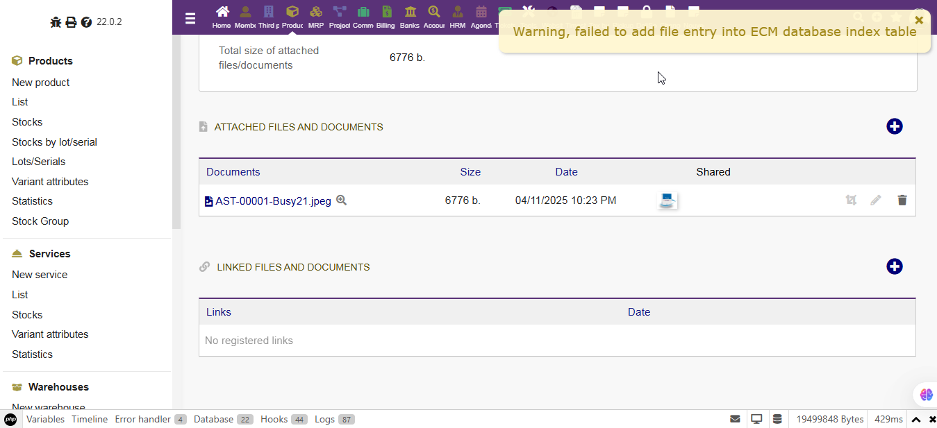 but now a new issue. after uploading any file, “Warning, failed to add file entry into ECM database index table” Error comes.