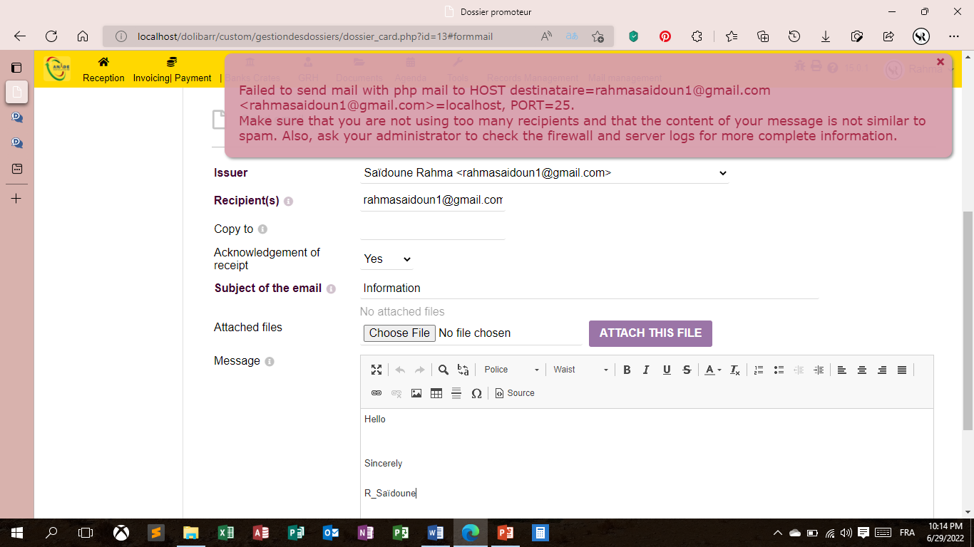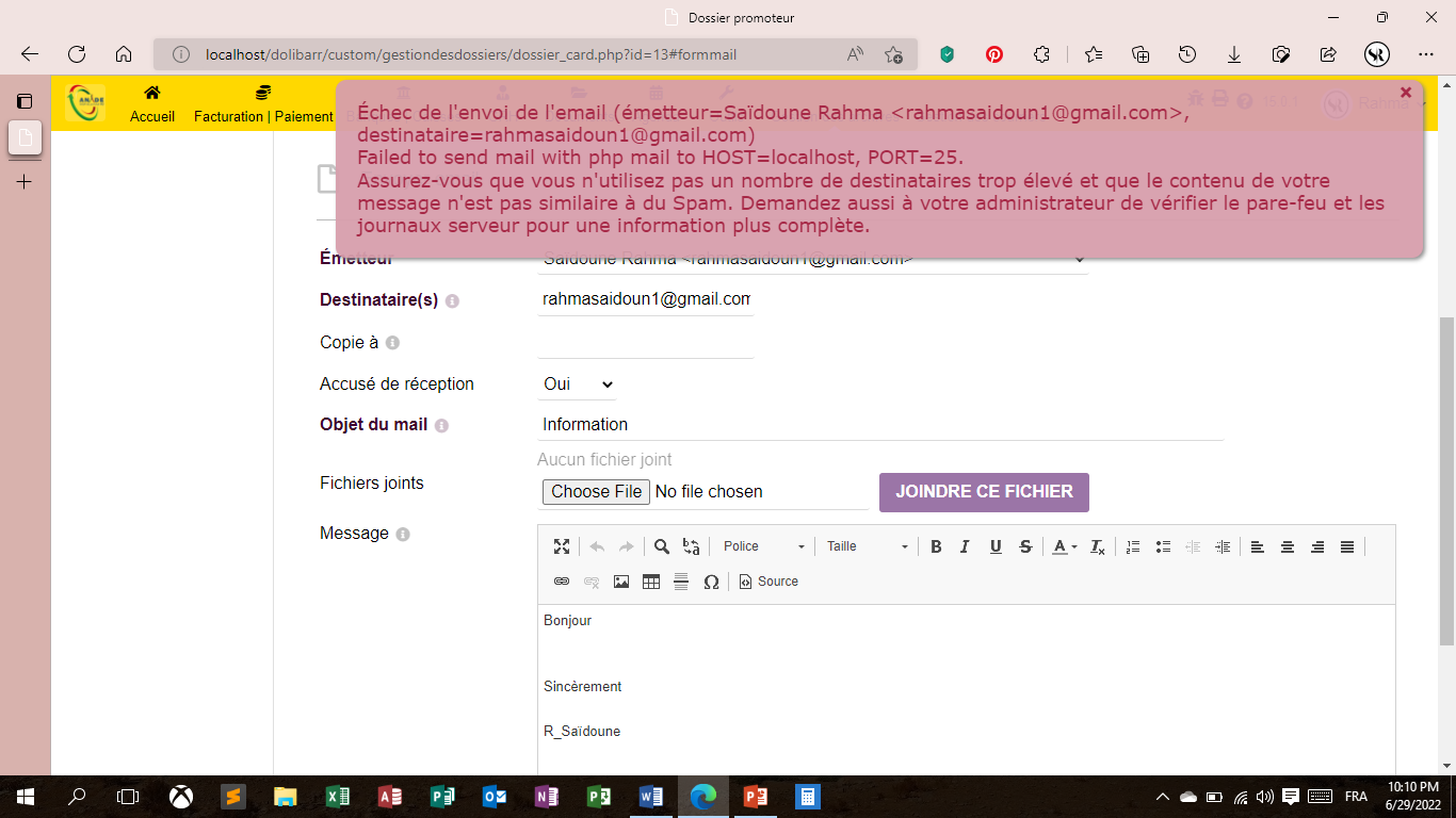 Warning : mail(): Failed to connect to mailserver at ālocalhostā port 25, verify your āSMTPā and āsmtp_portā setting in php.ini or use ini_set() in C:\dolibarr\www\dolibarr\htdocs\core\class\CMailFile.class.php on line 756