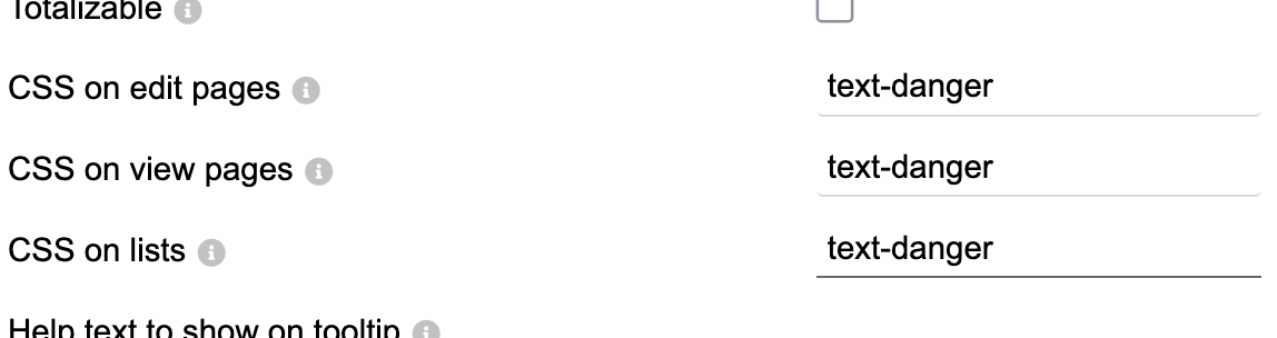 The screenshot I shared earlier is exactly how it works. The css class name is applied to the value in the field. I was testing it on a checkbox, and obviously, text-danger will not work on a checkbox. Perhaps the field should say “CSS class on edit/view/lists” instead of nebulous “CSS”.
