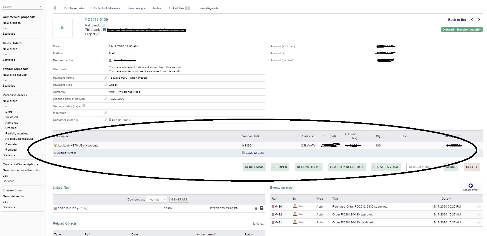 The process, continues as per Dolibarr workflow. I received the Delivery, add ths to Inventory and Issue Vendor Invoice.