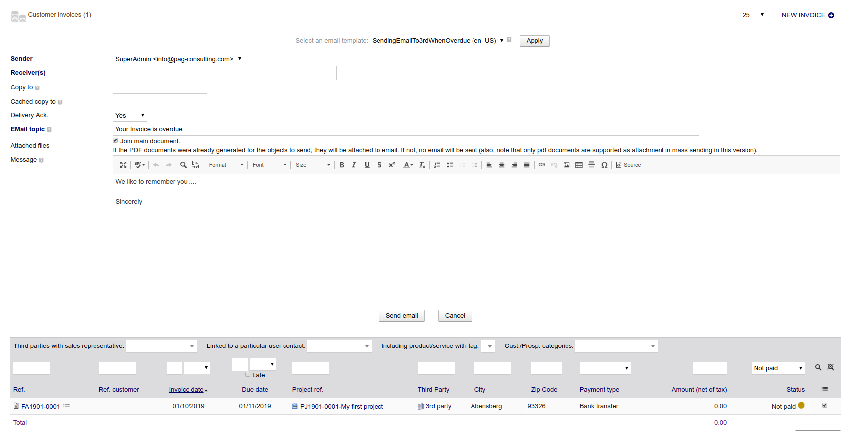 Thanks, this helped. I could actually send dunnings. Now I need to know where it is saved or written. Can’t find it anywhere in Dolibarr. I use Outlook 2010 but it is not the sent items either.