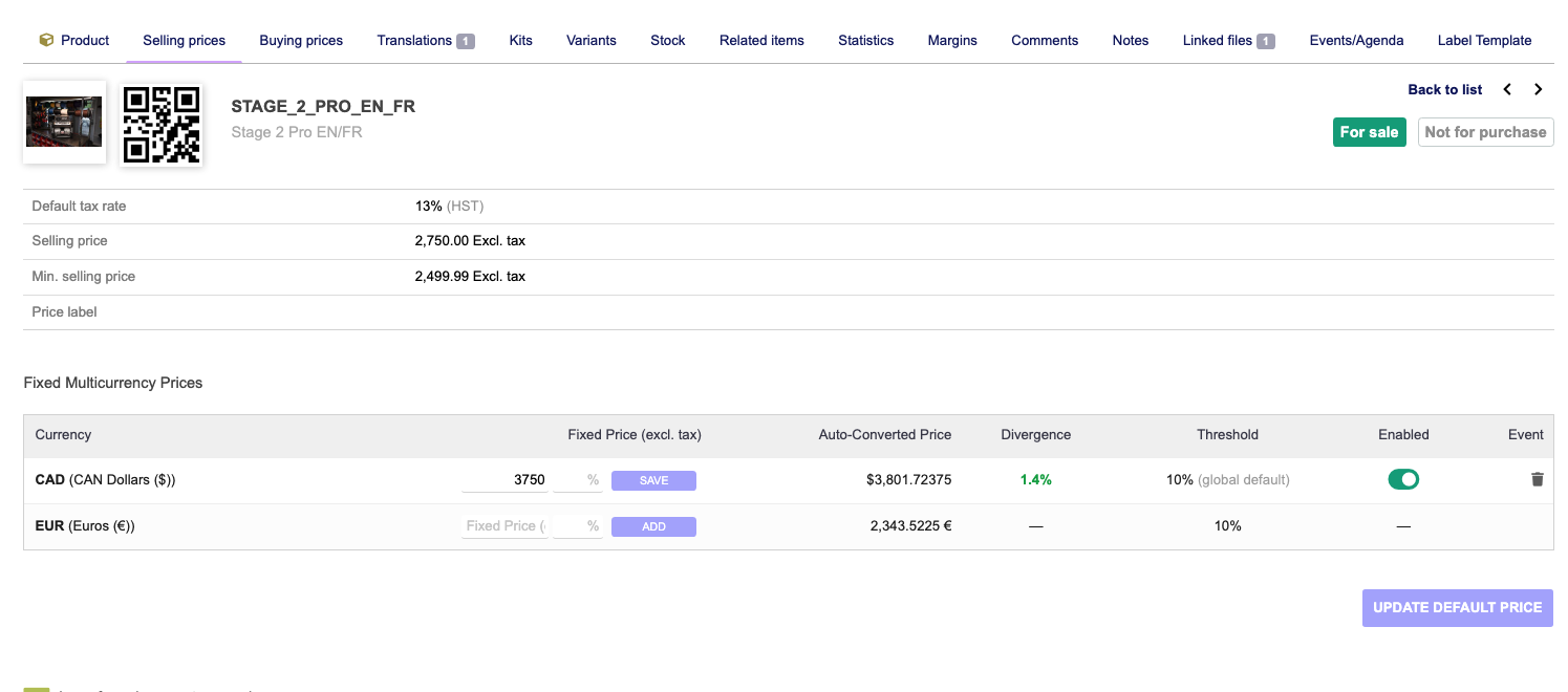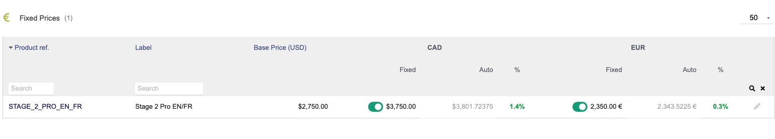 This module simply swaps in the fixed price on an invoice, proposal, or order based on the currency of the object. When the product loads, it will show it’s price in the native currency but once added will populate the record with the override fixed price.