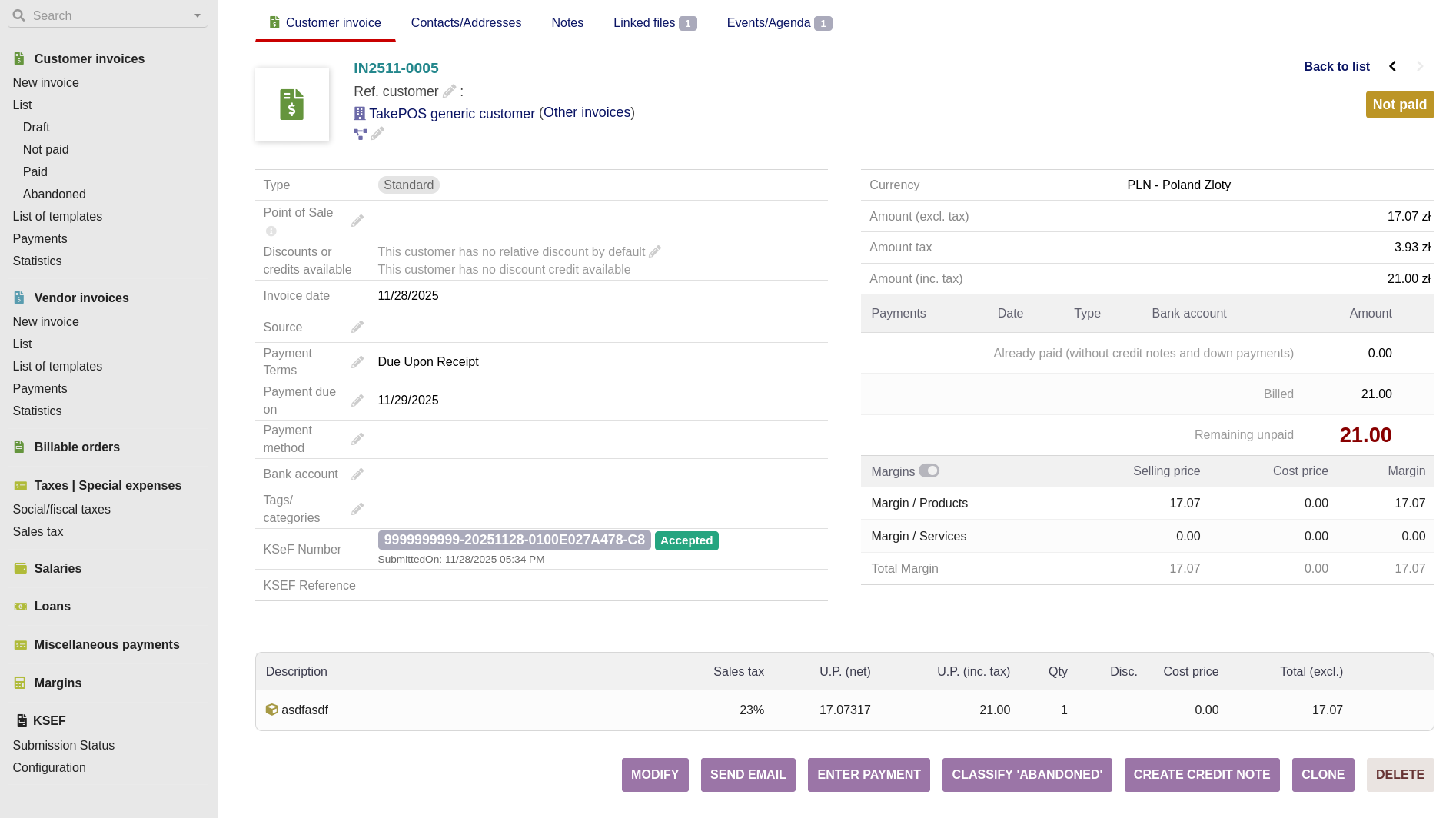 On the invoice page, next to “Validate Invoice” button, there is a Validate and Upload to KSEF button. If the invoice is validated “normally” with the Validate button, then instead a “Upload to KSEF” button appears instead. In the event the Third Party is added to the “exclude from KSEF” list in module settings, then these buttons will never appear (although in this example I’m using the Generic TakePOS customer for testing, in general I understand KSeF is not required to submit for B2C transactions)