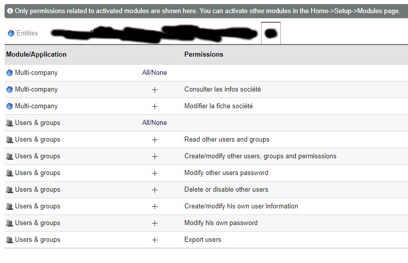 When adding a new entity to a group, that entity only has “Multi-company” and “Users & groups” as permissions. I need this particular entity to have permissions for the Suppliers module as well. The top text says that only permissions for activated modules are shown here, but the Suppliers module is activated (and used in the master entity) but it does not show up for this new entity.