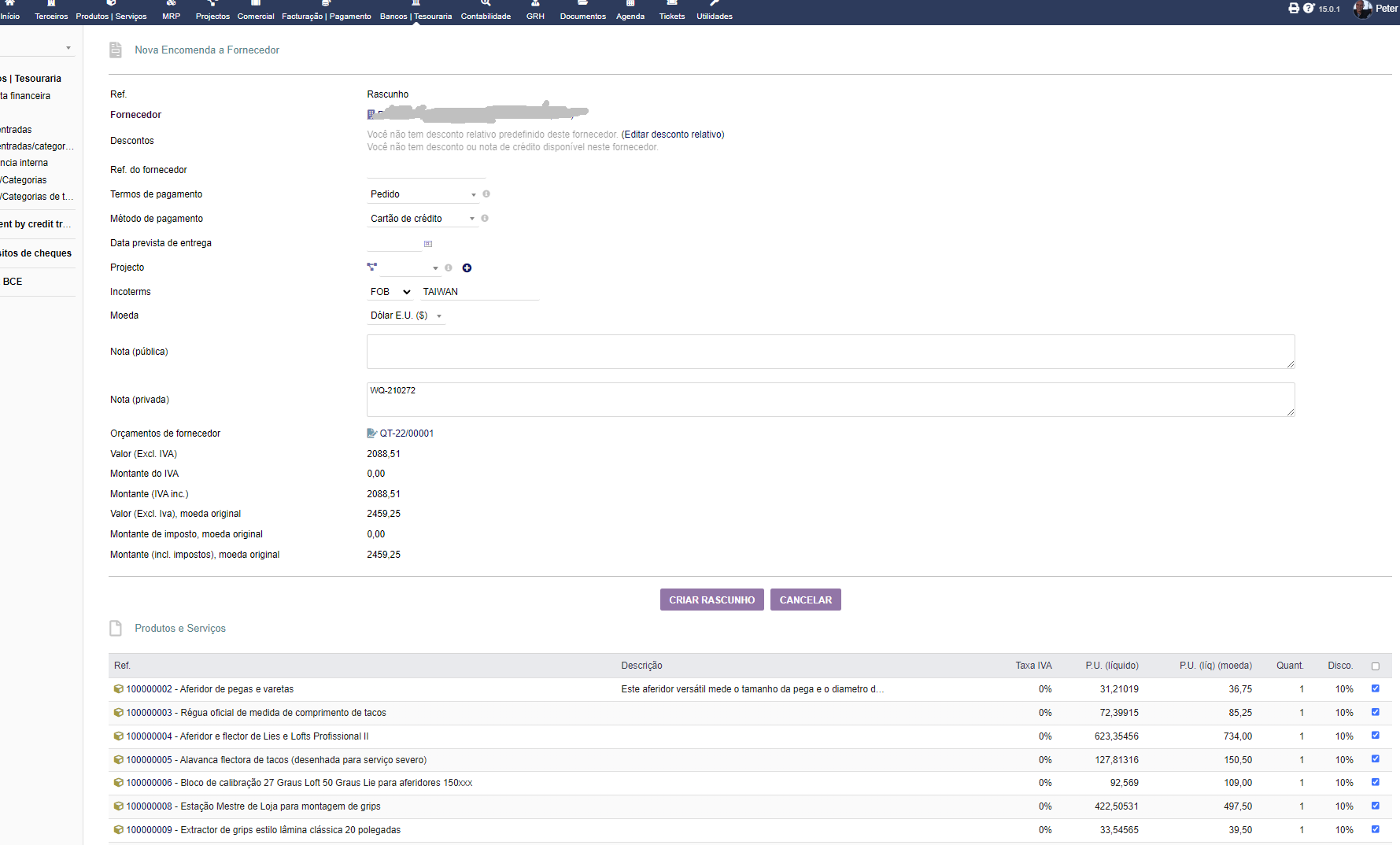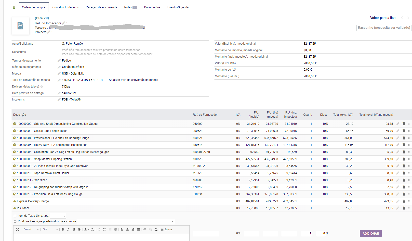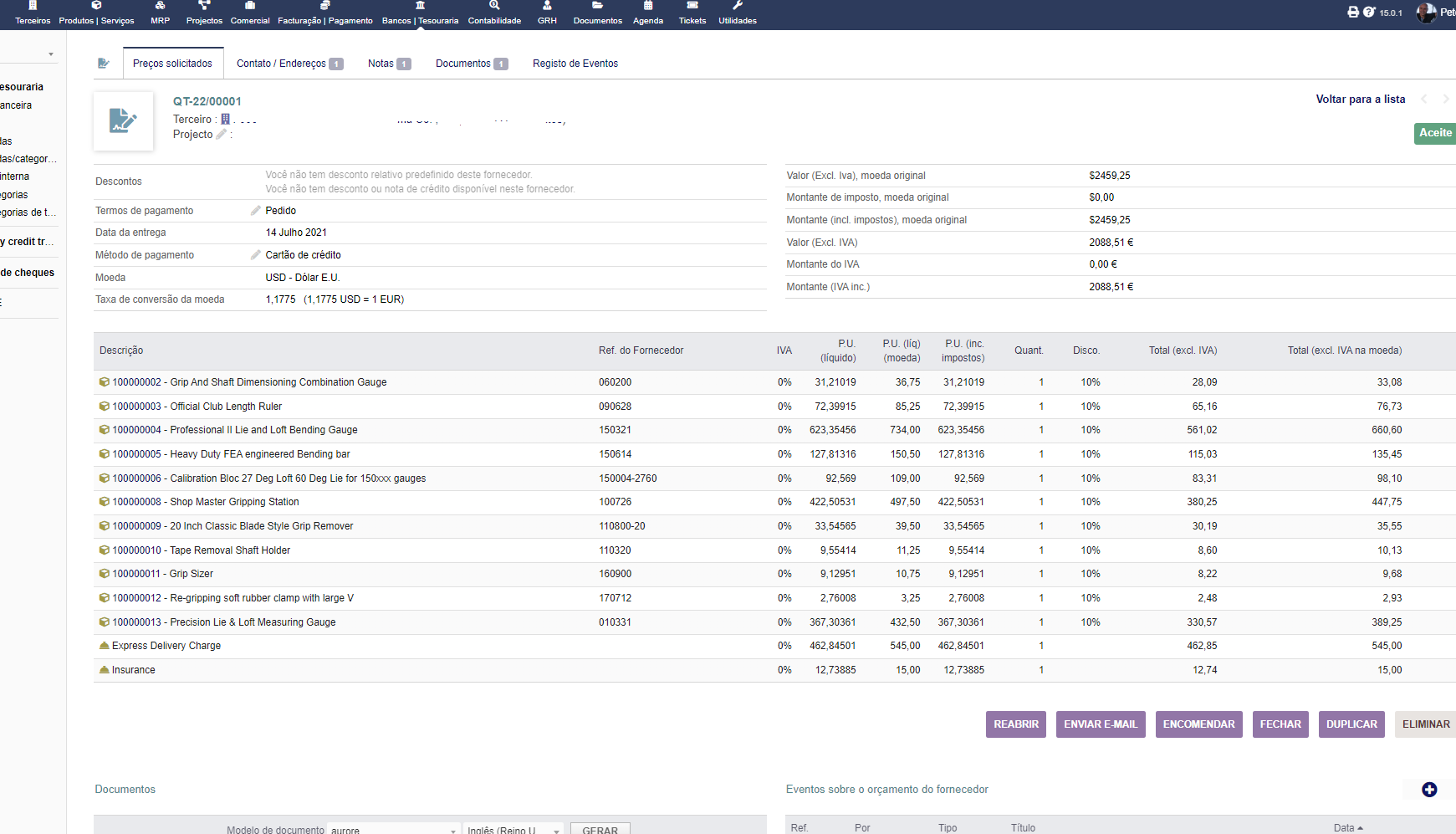 - Here is my Quotation request all filled up and nice with the suppliers’ prices. Counter value in Euros at the date of this quotation receival is just informative for now, nothing more. As you can see the total amount of the order of $2459.25 is the proposed value from the vendor. This is what he will expect me orther the products for.