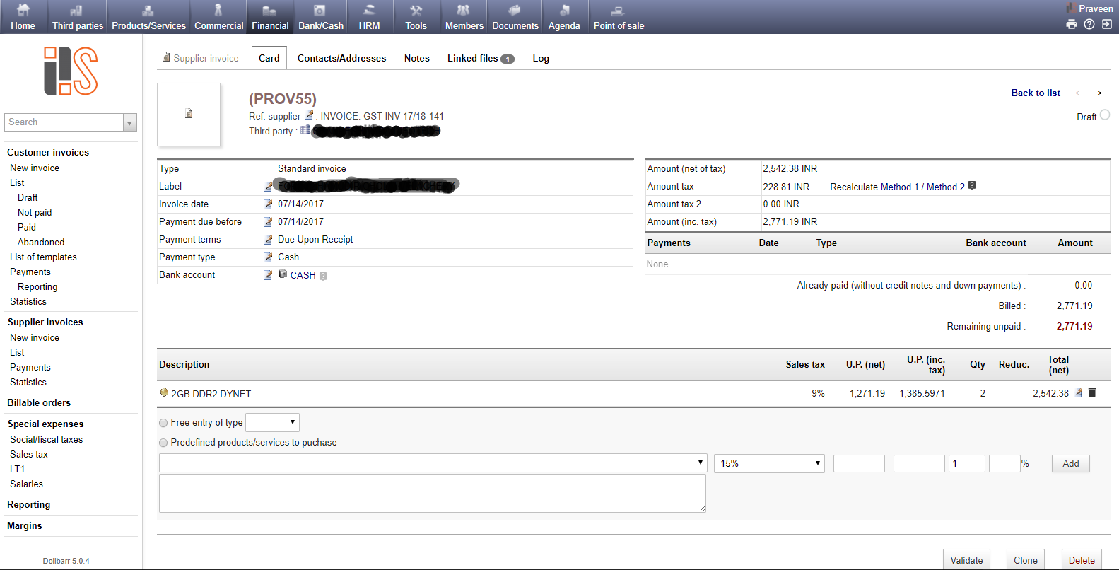 We need an ERP in which administrators can manually select the columns for taxation (upto 2 columns for products and upto three columns for services) with custom lables both for sale and purchase to cope up with the changing government rules and regulations.