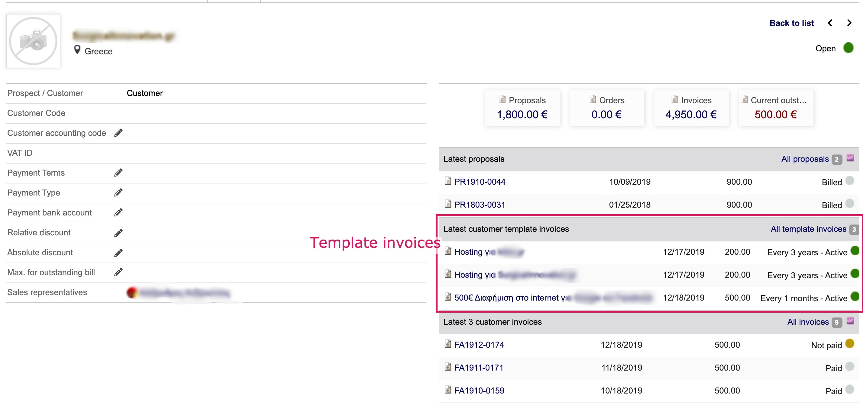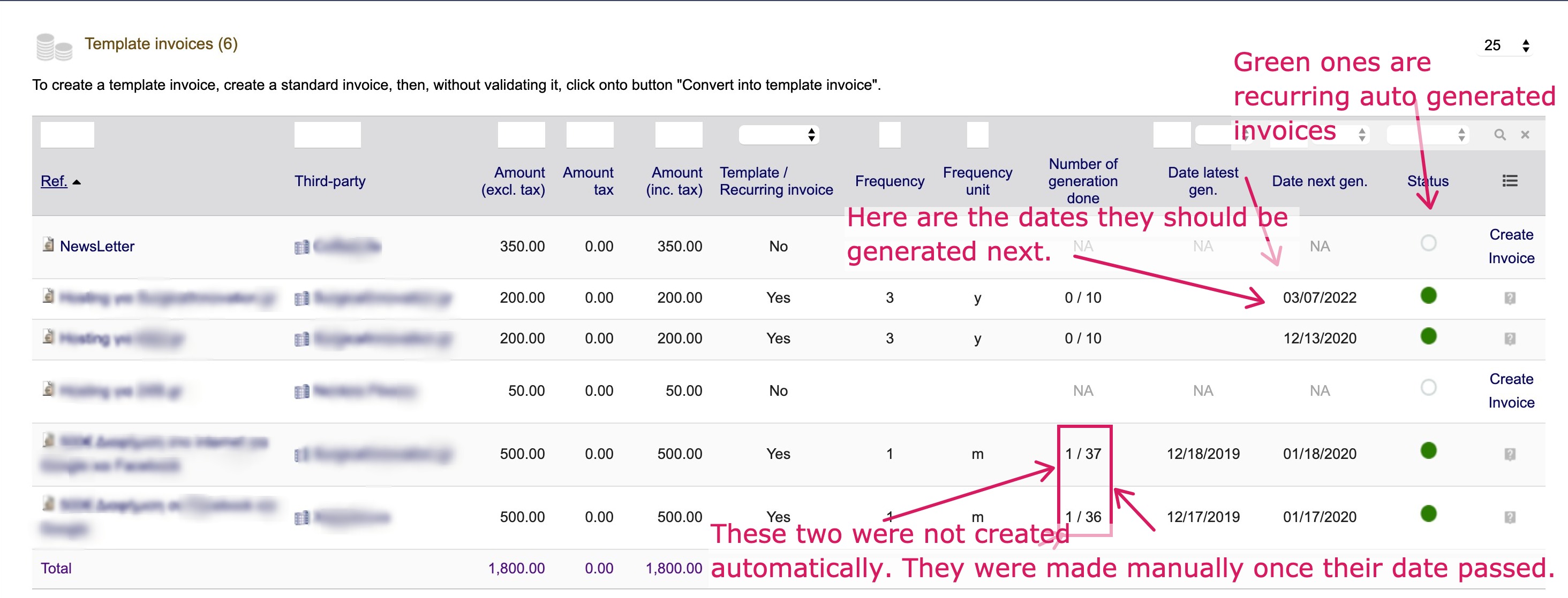 When I go to the list of template invoices they all seem fine. They are active, the counters are ok and they have a “next invoice creation date”.