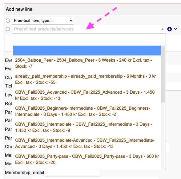 V21.0.1 here. When I click where the pink arrow is pointing I do get some products/services to select from - HOWEVER I only get products/services which are actually marked for sale.