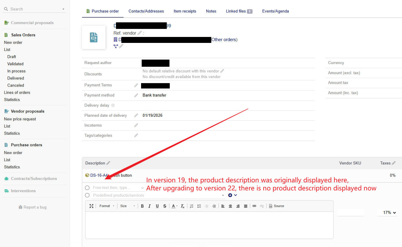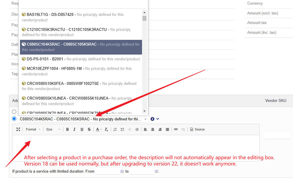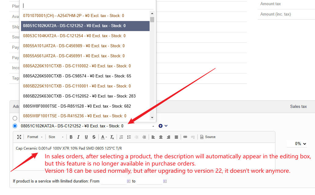 In sales orders, after selecting a product, the description will automatically appear in the editing box, but this feature is no longer available in purchase orders.