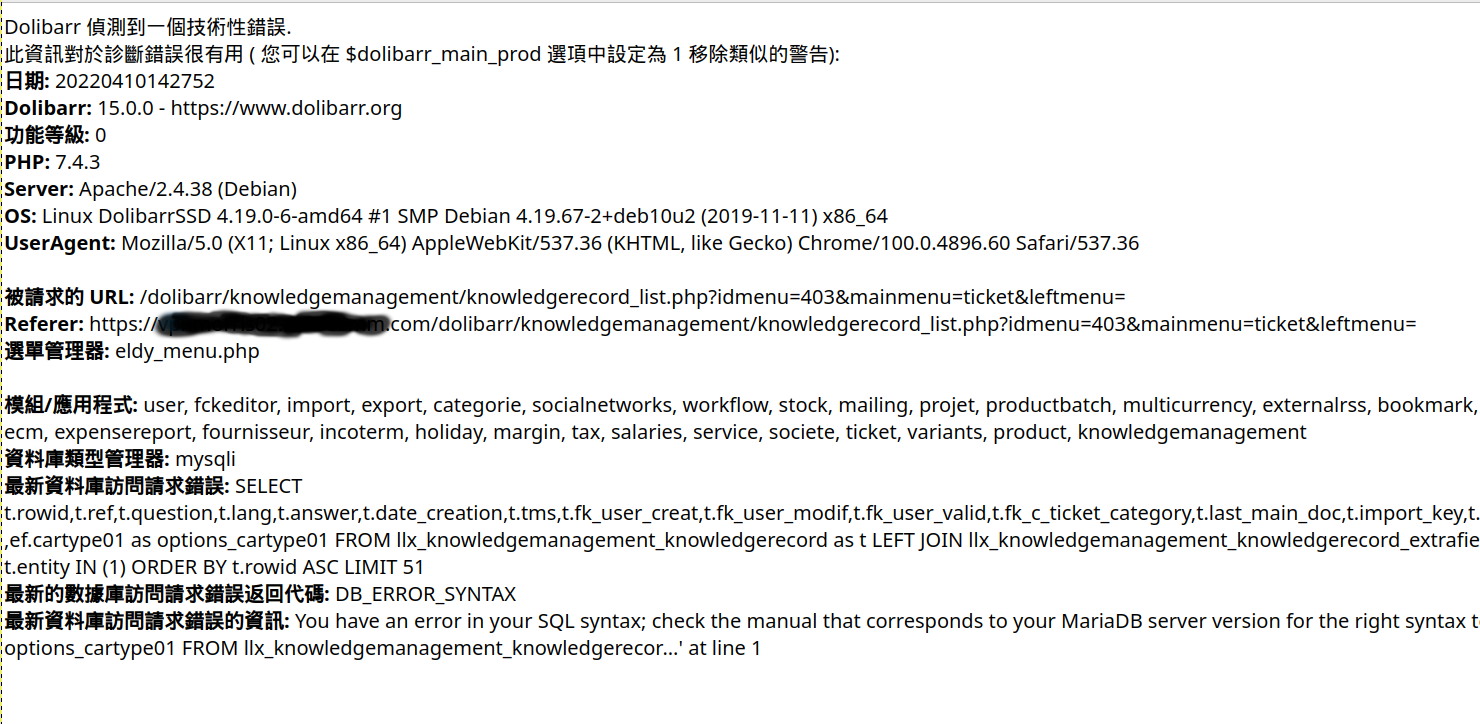 Information for latest database access request error: You have an error in your SQL syntax; check the manual that corresponds to your MariaDB server version for the right syntax to use near ‘ef.caryear as options_caryear FROM llx_knowledgemanagement_knowledgerecord as…’ at line 1