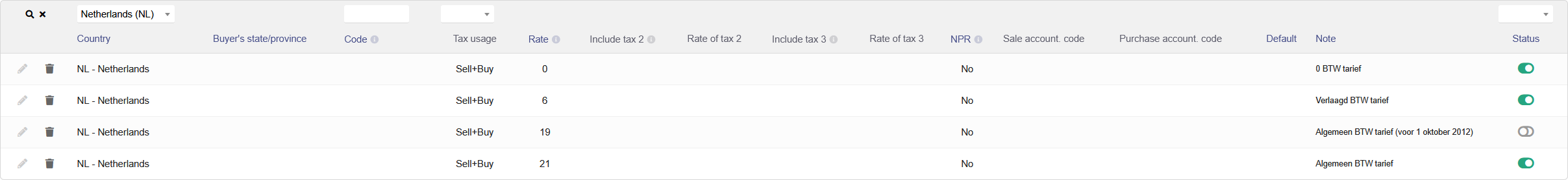 I have switched / imported chart accounts for NL and realized that 21% VAT (which is active since 2012) is off by default in Dolibar. Any ideas why? I would suggest to change labels and enable the corresponding 21% box by default (as shown in the 2nd screenshot).